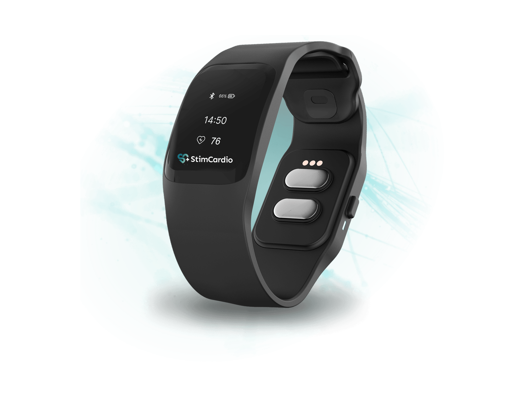 Rhyvive™ is the wrist-worn wearable component of the StimCardio platform. It integrates: